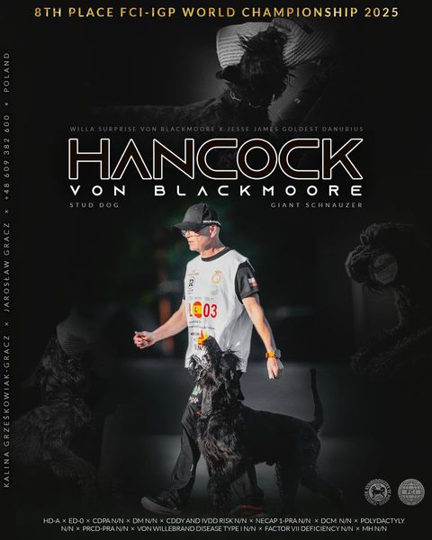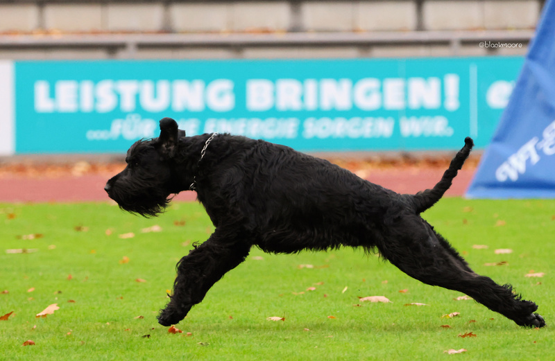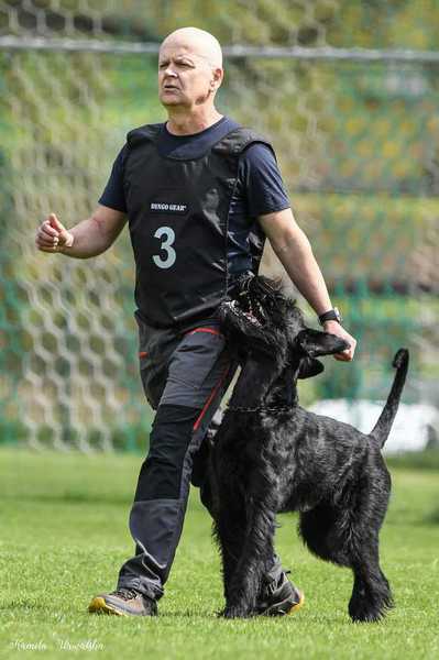 Vancouver ist ein sehr kräftiger Rüde mit super Haar und einem tollen Gangwerk. Sein Kopf ist gestreckt. Er ist kurz im Rücken und hat eine sehr ausgeprägte Vorbrust. Starke Knochen und eine perfekte Rute. Die guten Winkelungen sind ebenfalls zu erwähnen. Sein Charakter ist typisch für Riesenschnauzer.